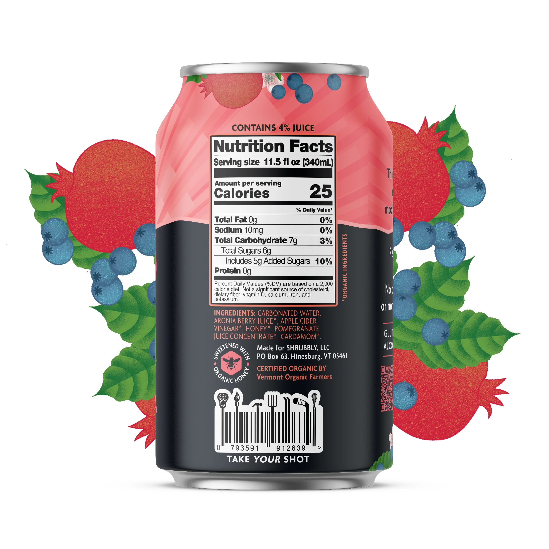 Ingredients: Carbonated Water, Organic Aronia Berry Juice, Organic Apple Cider Vinegar, Organic Honey, Organic Pomegranate Juice Concentrate, and Organic Cardamom